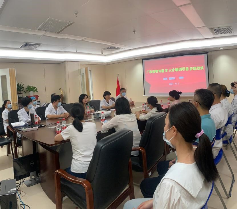 第七次全国人口普查结果显示,我国60岁及以上人口约为2.6亿人,占18.70%,我国人口老龄化程度进一步加深,建立完善老年健康服务体系刻不容缓。老年医学人才也被国家列为紧缺人才,加紧培养。为提高老年医学人才队伍整体素质和专业水平,根据广东省卫健委《广东省老年医学人才培训项目实施方案》,深圳市人民医院作为广东省首批老年医学人才八大培训基地之一,于9月1日下午在老年病科六楼会议室召开了2021年度全国老年医学人才培训暨广东省首期老年医学人才培训班(深圳基地)开班仪式。深圳市人民医院副院长梁真,老年病科主任姜昕、副主任蒋科威,护士长邓武红和李锦铃、各位授课老师及省卫健委选派的来自中山市、惠州、梅州的8名医生及1名护理学员参加此次开班仪式。